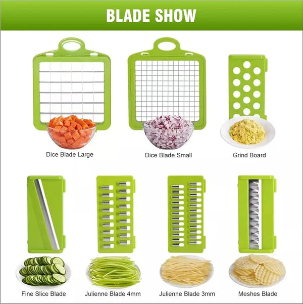 Superior quality - The latest multifunctional vegetable prep tool (made of high quality stainless steel and food grade plastic); this highly versatile tool will chop, dice, slice or grate most types of fruits and vegetables easily and safely. 14 blades/components - Veggie Slicer contains 7 different sizes of interchangeable blades for dicing, slicing or grating. The rust-resistant stainless steel maintains sharp edges for crisp cuts and smooth grating. The tool also holds a peeler, egg separator, press cut, colander, hand protector, cleaning brush and blade storage for a total of 14 pieces. Design innovation - The built-in cutting lid allows food to be cut directly on the unit and into a 1.2L storage container. Save time while eating healthier - Prepping fruits and vegetables takes time and effort: the 14 piece veggie slicer saves both while adding valuable nutrients to your diet.